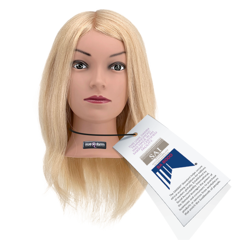 Questa testa da manichino con capelli umani indiani di 60 cm è particolarmente adatta per realizzare acconciature raccolte.
